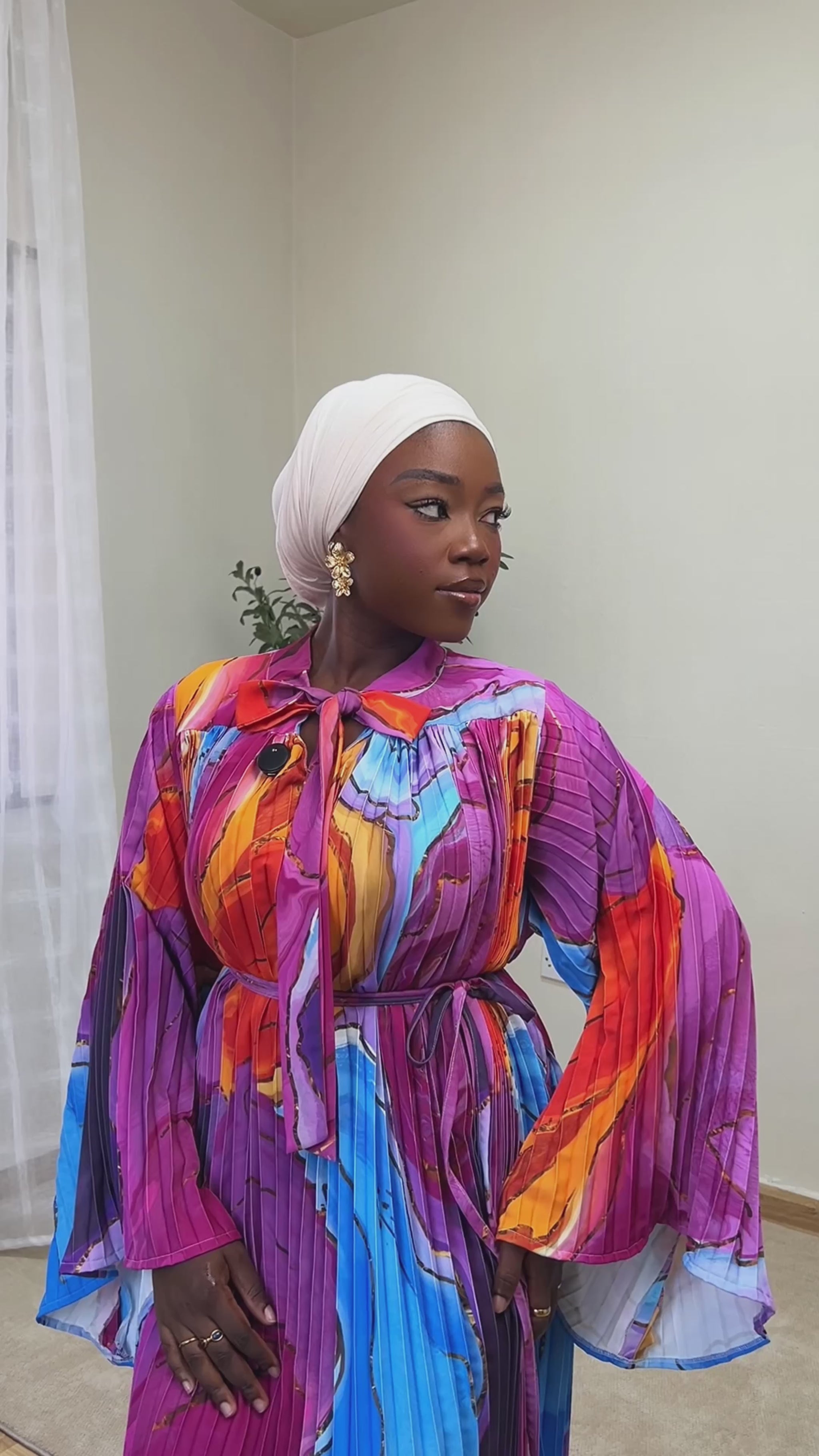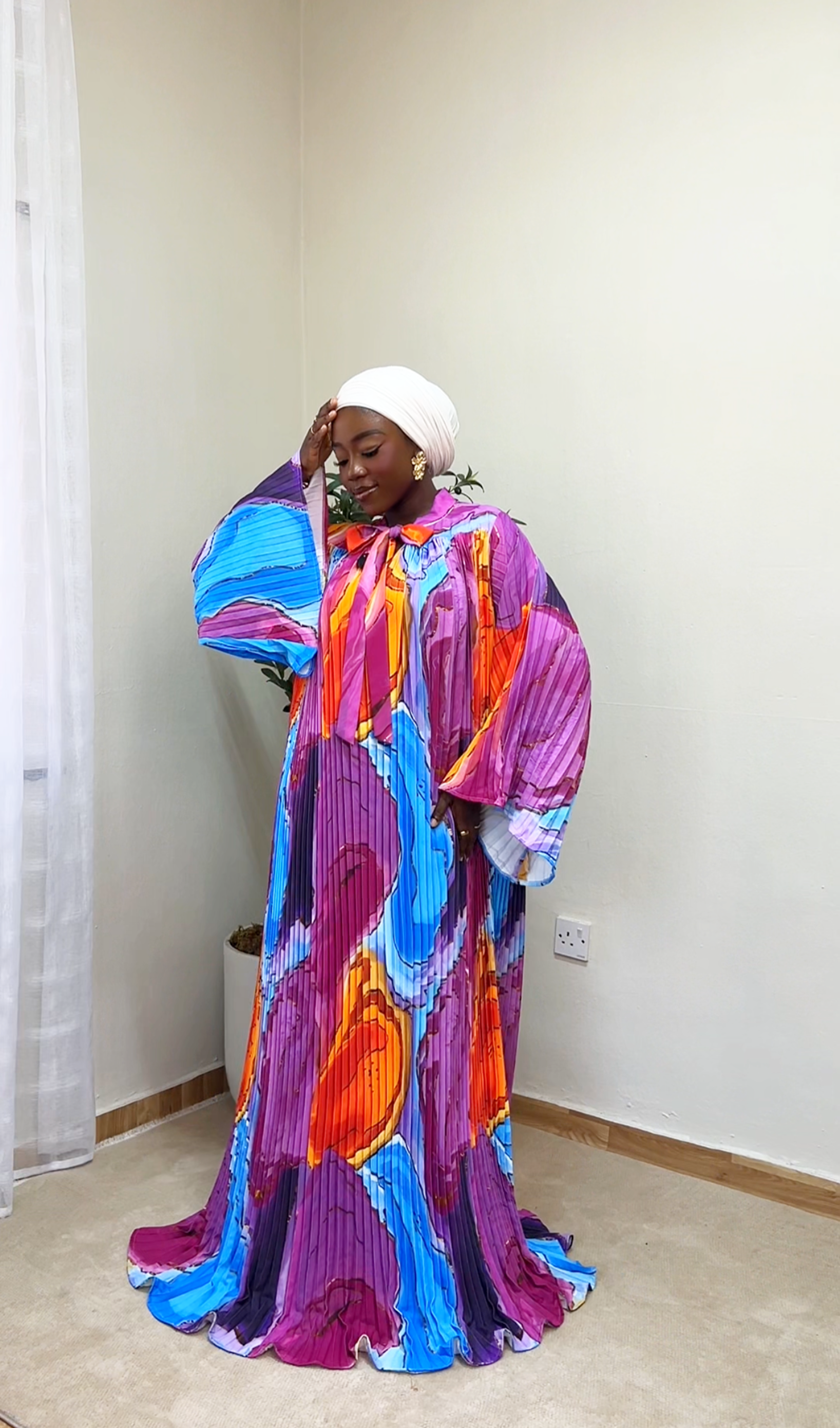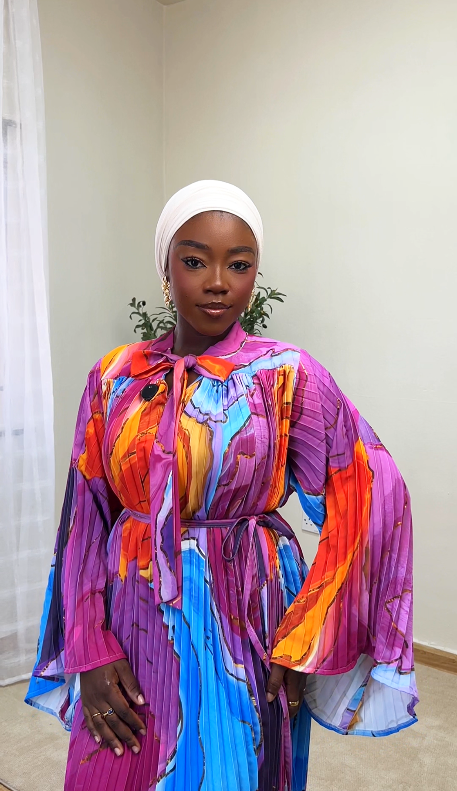 Crafted from lush crepe fabric in our exclusive custom art print, this full pleated dress is a true statement piece. It features exaggerated sleeves, a chic tie-bow neck detail, and comes with a detachable belt for versatile styling.