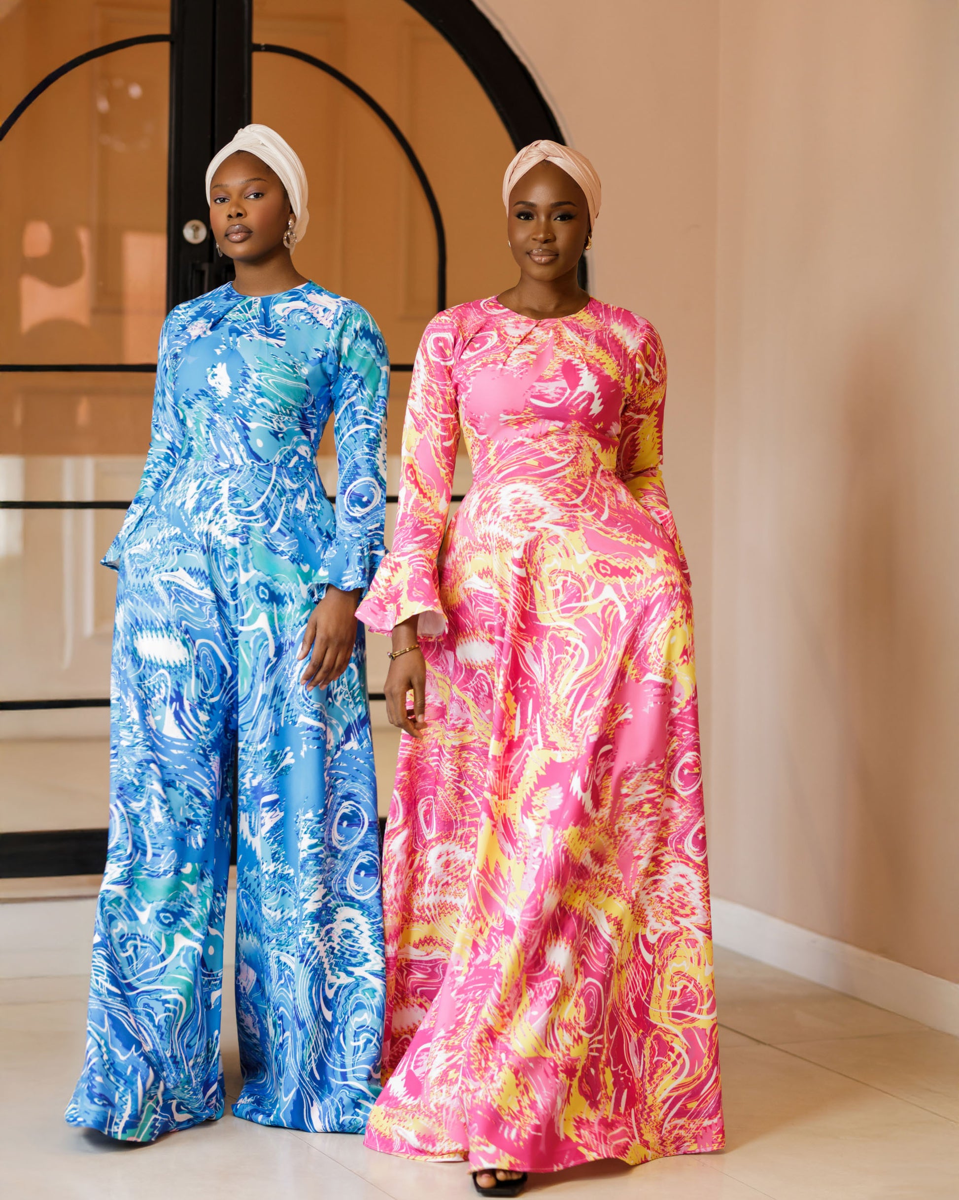 A full-flare maxi dress crafted from vibrant custom crepe print, featuring elegant bell sleeves and a refined minimal neckline for a timeless, graceful look.