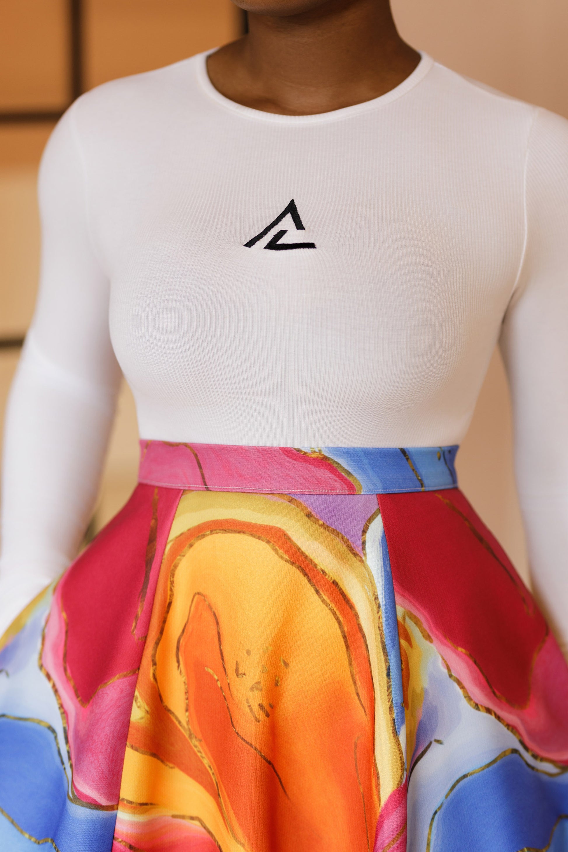 Crafted with a bold, art-inspired print, this statement skirt adds effortless flair to your wardrobe. Designed with six structured panels for a flattering flow, it features a firm waistband that enhances your silhouette while keeping you comfortable. Functional side pockets add a practical touch, making it both stylish and versatile.